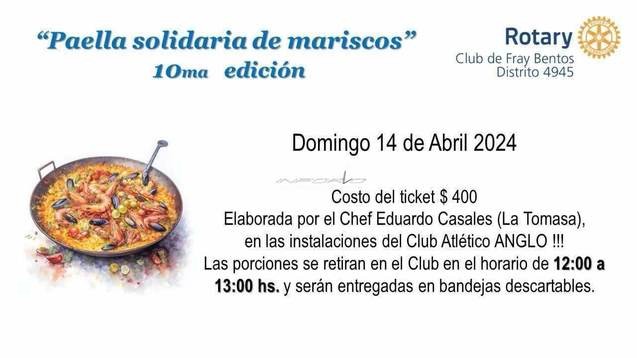 Se viene una nueva edición de la Paella de Rotary en su 10° consecutiva. Son aproximadamente unas 120 porciones por lo que hay que reservar con tiempo. Es Paella de Mariscos, como cada año en las instalaciones del Club Atlético Anglo a cargo del Cheff Eduardo "Peki" Casales y se levanta ese mismo domingo d...